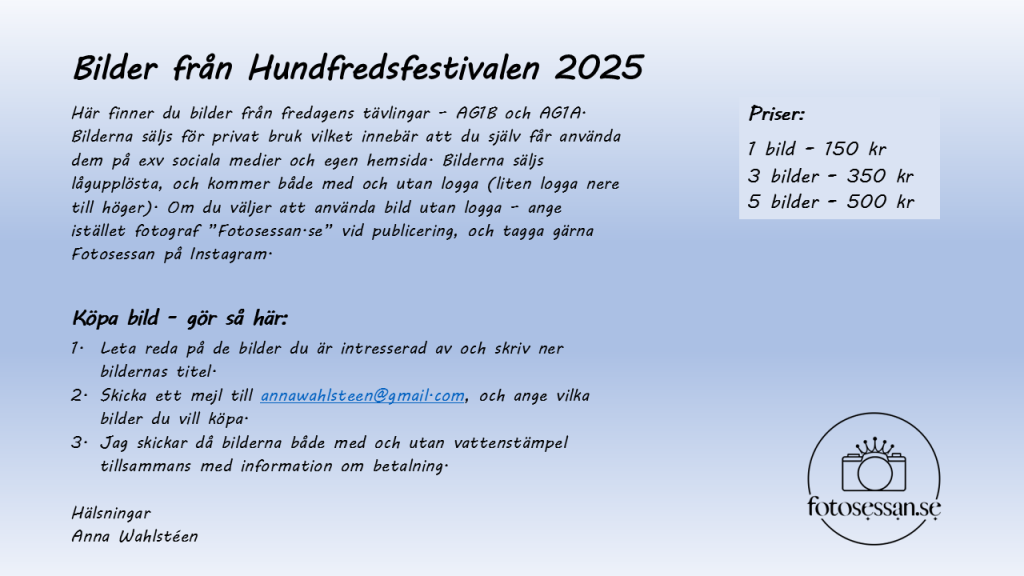 Nu är mina bilder från fredagens tävlingar vid Hundfredsfestivalen klara. Du hittar dem via denna länk: Fotosessans bilder – Hundfredsfestivalen